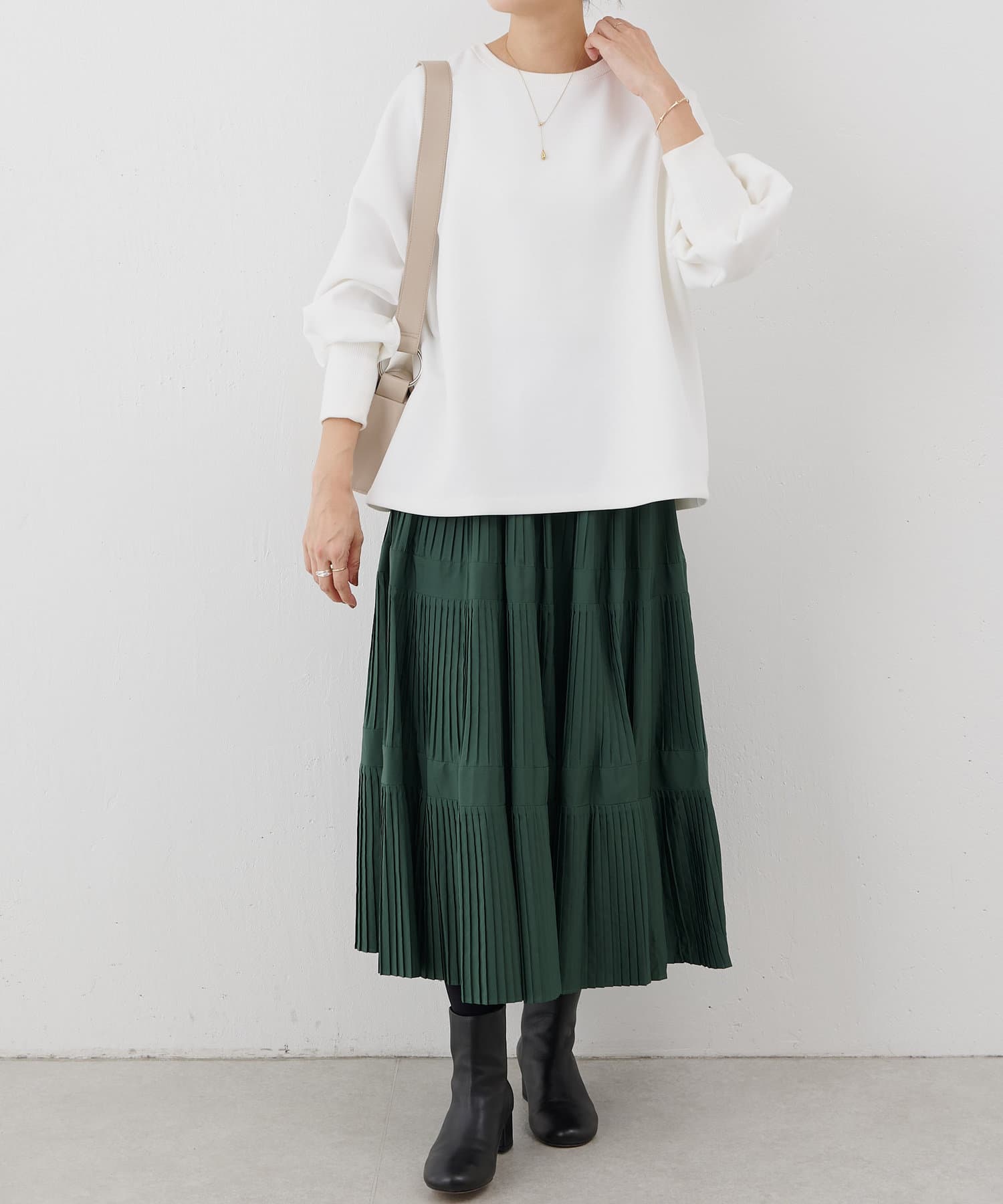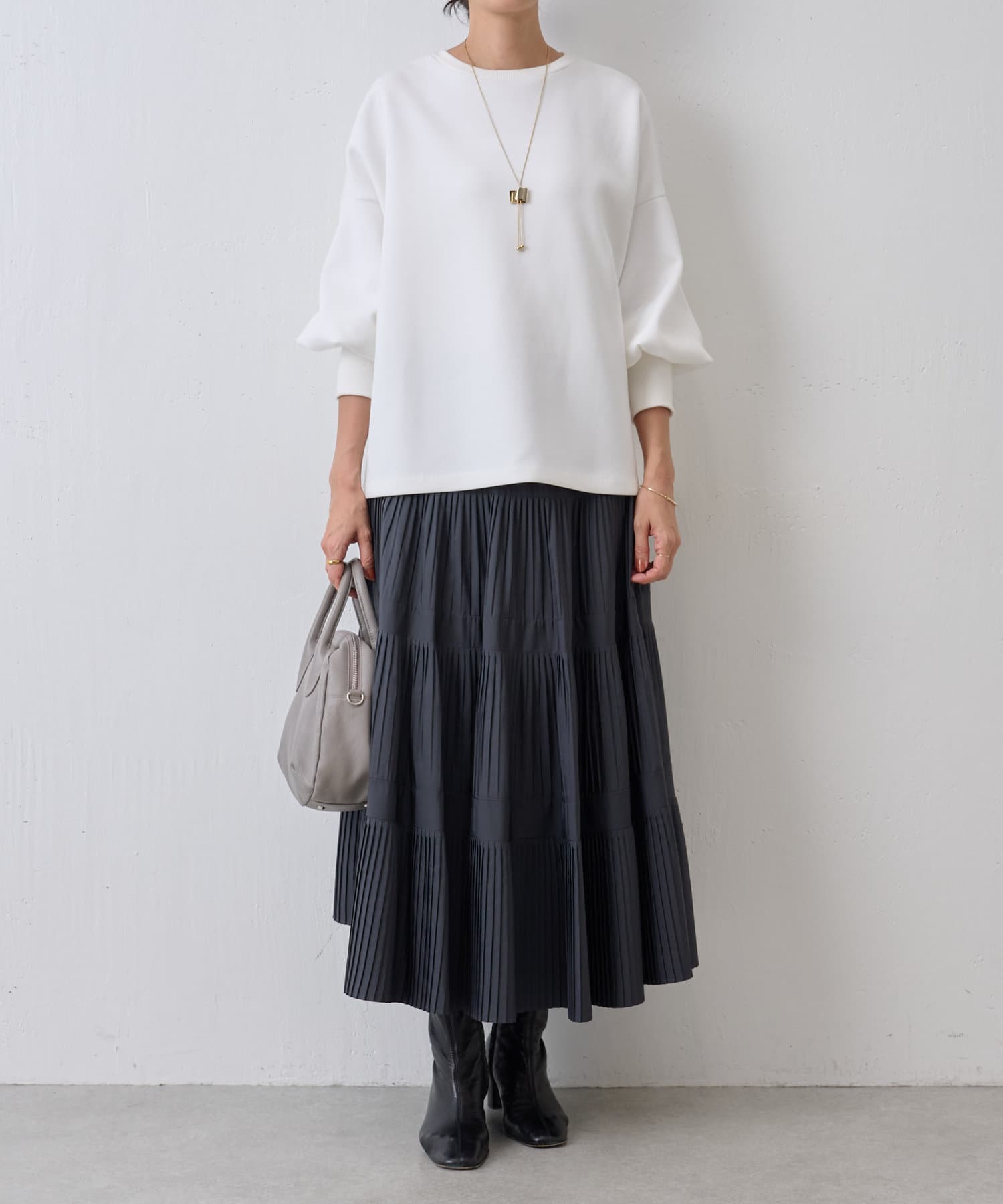 The pleats are slim and refined, preventing excessive volume while still offering graceful movement. A subtle sheen adds a touch of elegance, making it perfect for both casual and polished looks. With its wrinkle-resistant fabric, full lining, and comfortable elastic waistband, it’s a reliable staple you’ll reach for season after season.