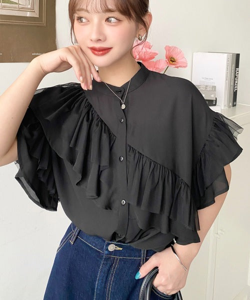Moment+ Chiffon Georgette & Tulle Double Frill Short Sleeve Blouse | Elegant & Feminine | 5 Pastel & Classic Colors