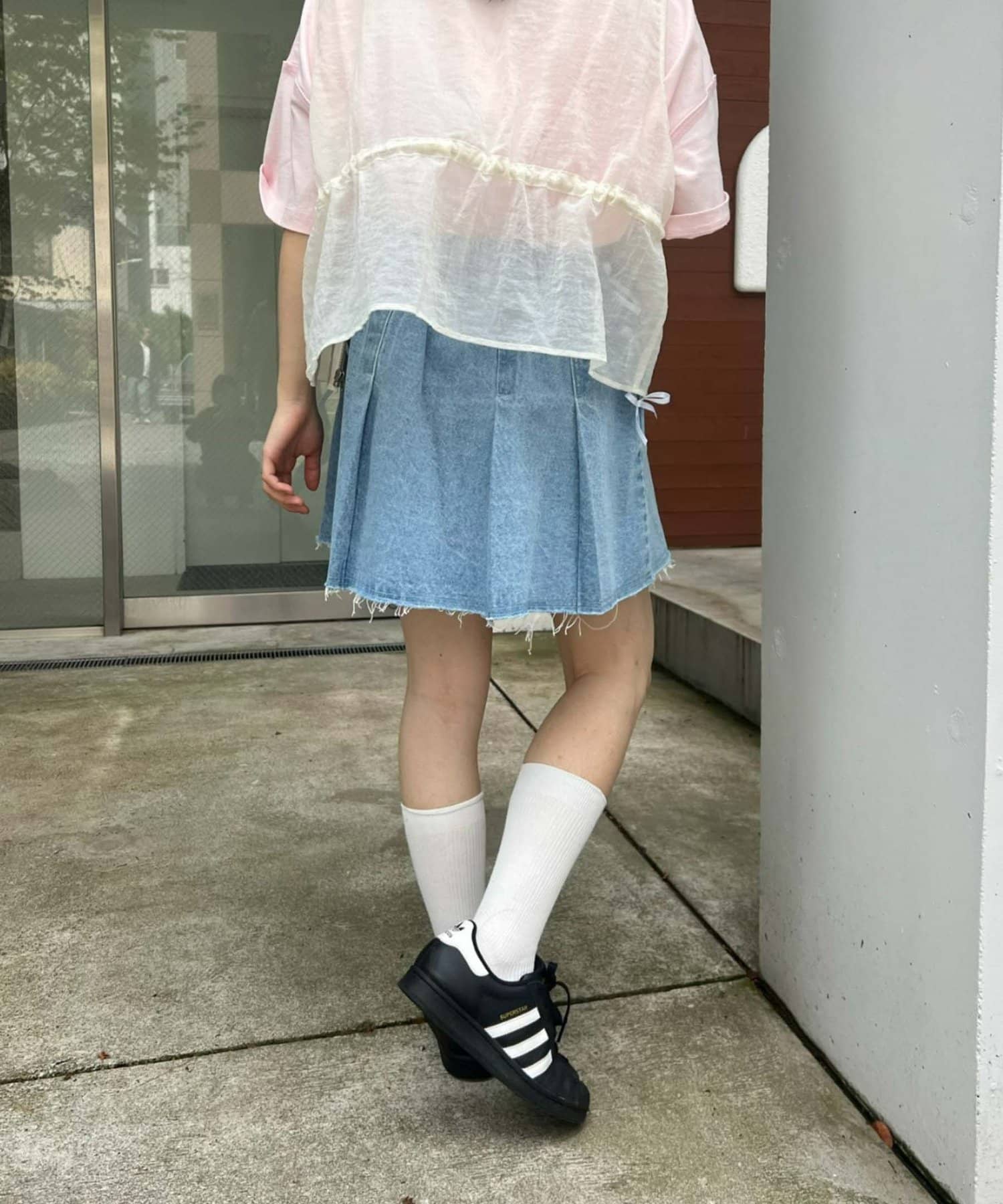 CIAOPANIC TYPY Satin Ribbon Denim Skirt Girly Pleated Mini with Vintage Edge
