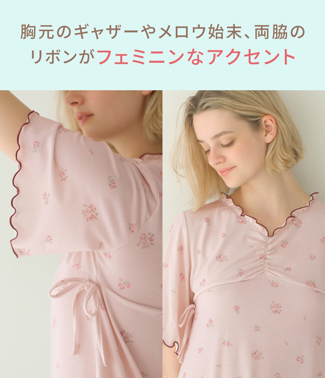 🎀 Charming Details – Ruffle neckline, side ribbons, and gathered chest