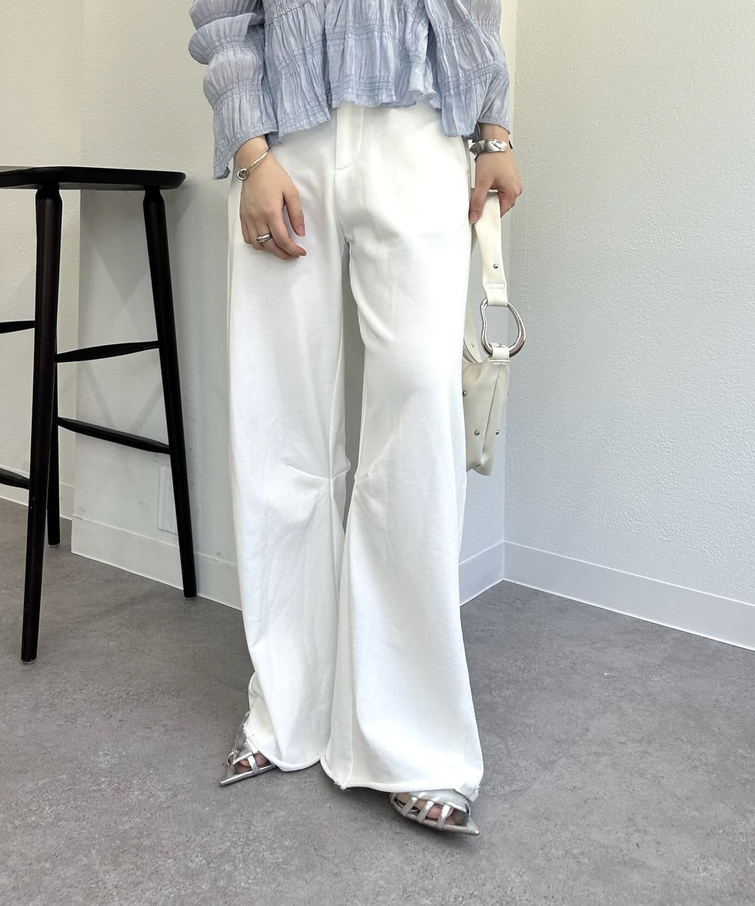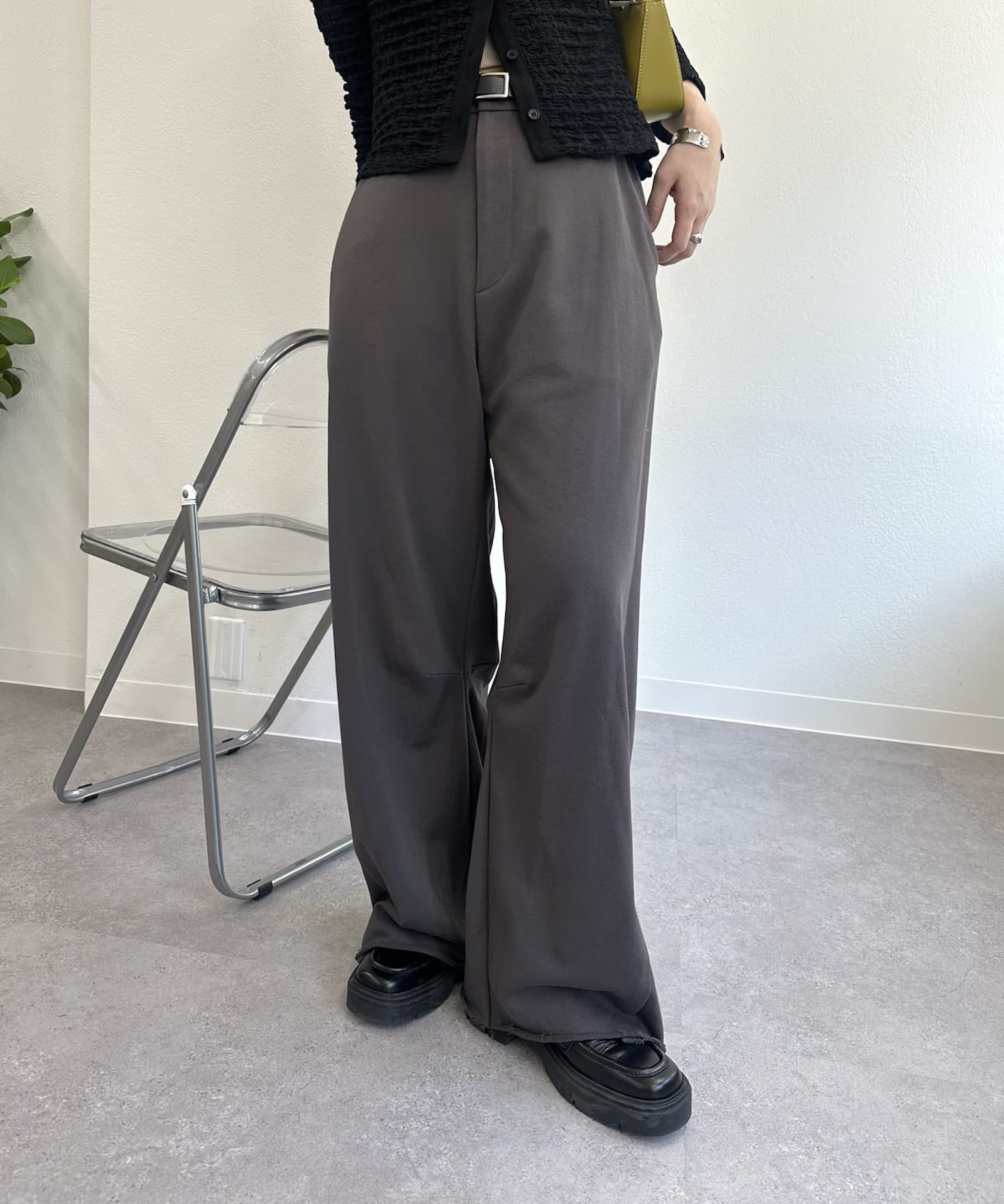 Unlike ordinary sweats, they feature belt loops at the waist, allowing you to tuck in your top for a polished look or wear them loose for laid-back styling. The elastic waistband at the back ensures a stress-free fit, while the raw-cut hem brings a relaxed finish that pairs easily with sneakers, sandals, or heels.