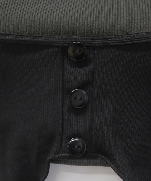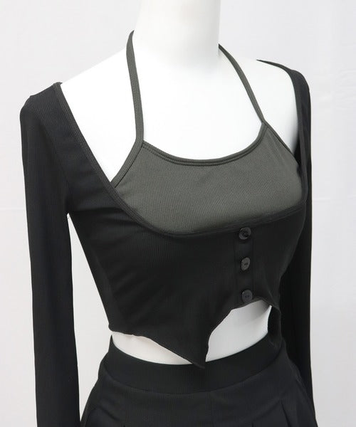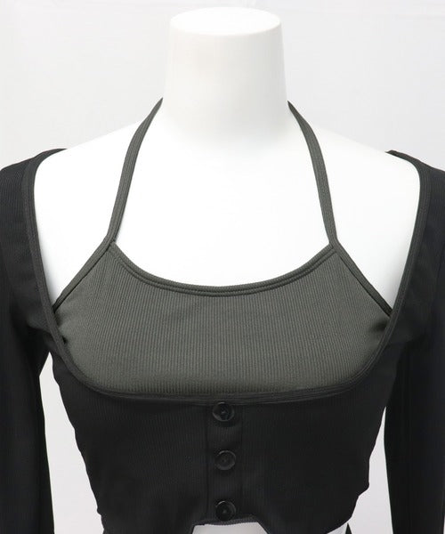 🧶 Cardigan-Inspired Top – Faux button-up ribbed top layered over a halter bikini for a cute and modest look