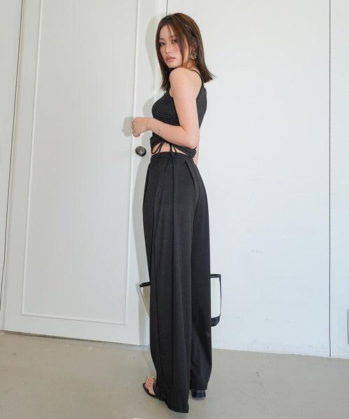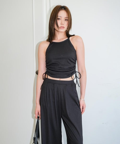 The American-sleeve camisole features adjustable drawstrings at both sides, letting you control the drape and coverage. Pair it with the relaxed-fit long pants to subtly conceal the hips and legs while maintaining a polished silhouette thanks to the flattering pleats.
