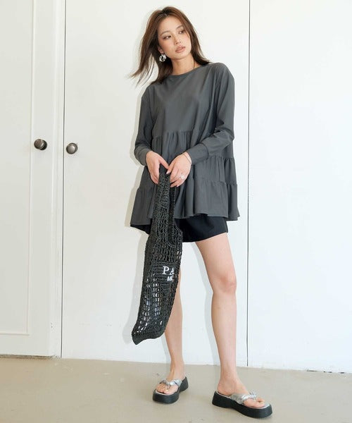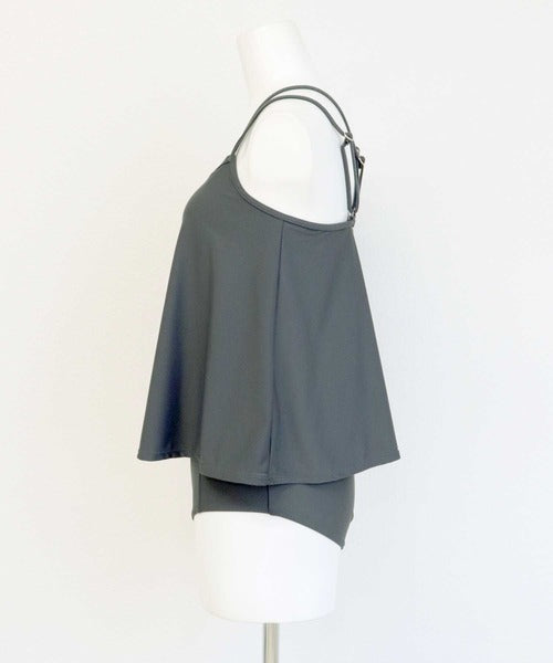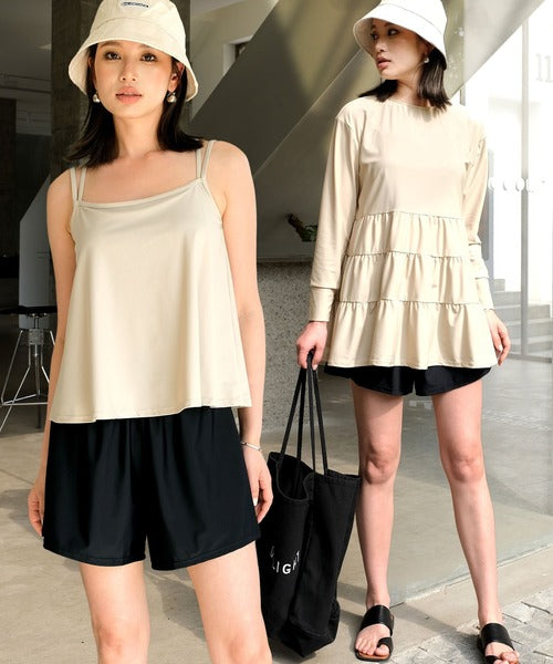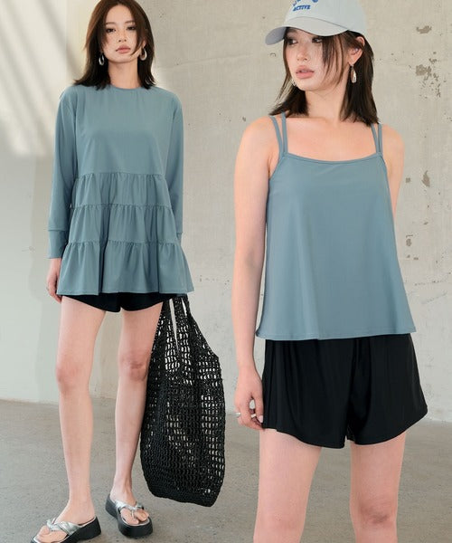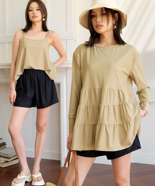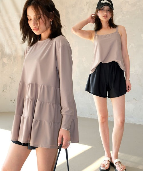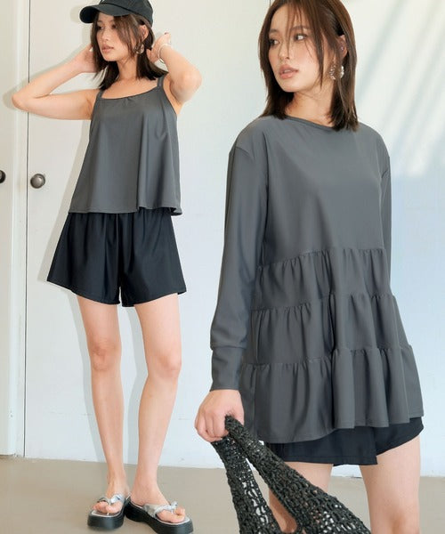 This stylish set includes a flared rash guard with tiered frills, a comfortable camisole-style bikini top with built-in padding, matching bikini bottoms, and short pants. Designed with thoughtful coverage and sweet feminine accents, it offers a relaxed tunic silhouette and freedom of movement—like wearing your favorite loungewear to the water.
