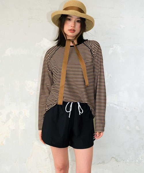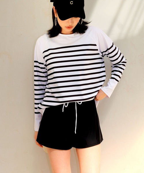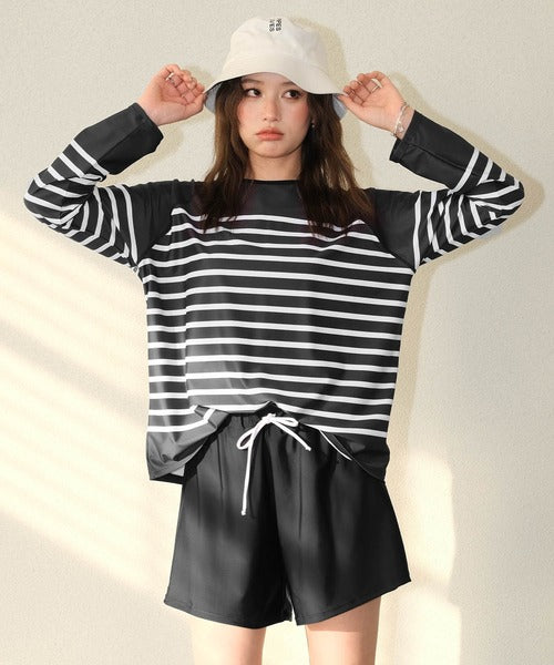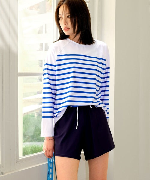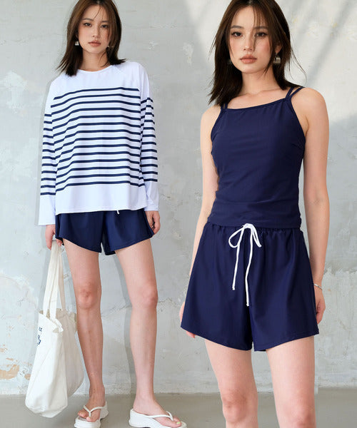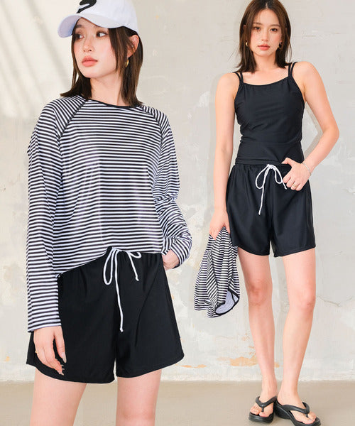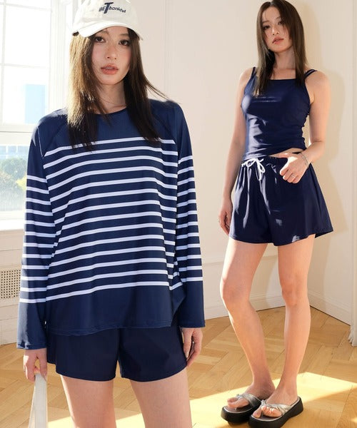 The set includes a rash guard top, tankini camisole bikini, bikini shorts, and short pants, offering versatile styling and full coverage. The tankini’s double straps add a subtle accent, while the rash guard comes in two stylish stripe patterns — thin raglan stripes or a marine-inspired design. Made from lightweight, quick-dry fabric that feels smooth on the skin, it’s perfect for both water and land activities.