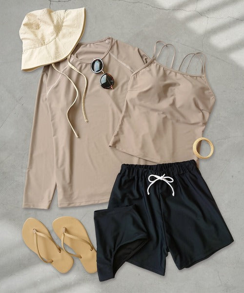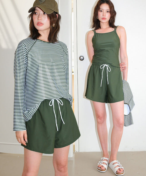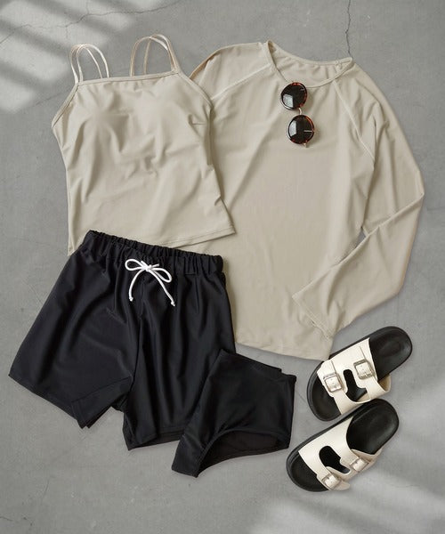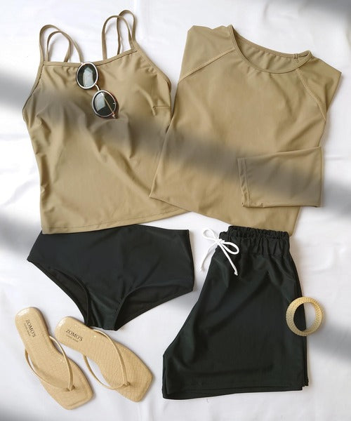 - Contents : Rash Guard, Tankini Camisole, Bikini Shorts, Short Pants