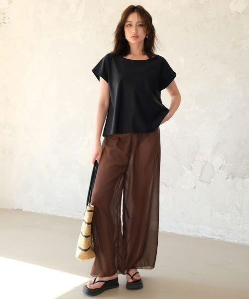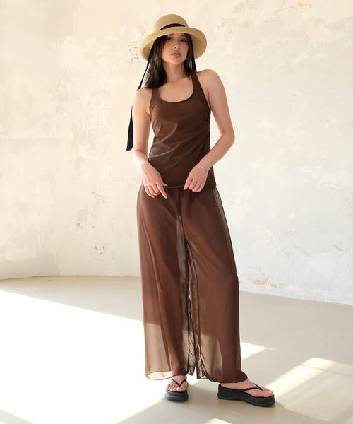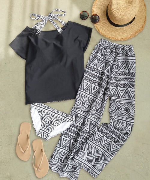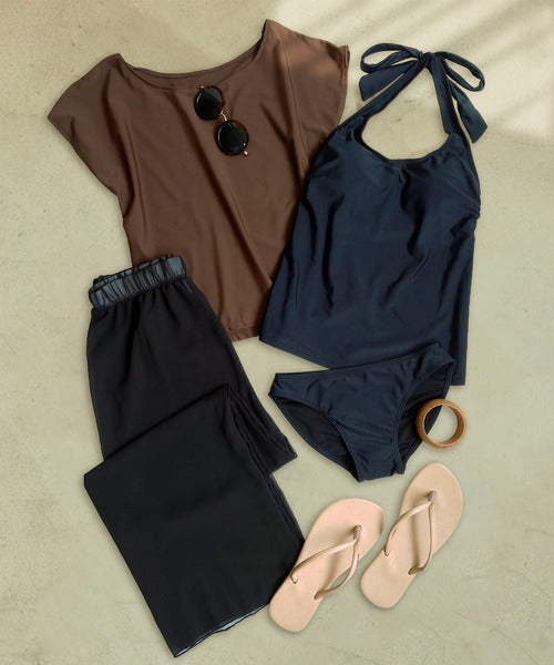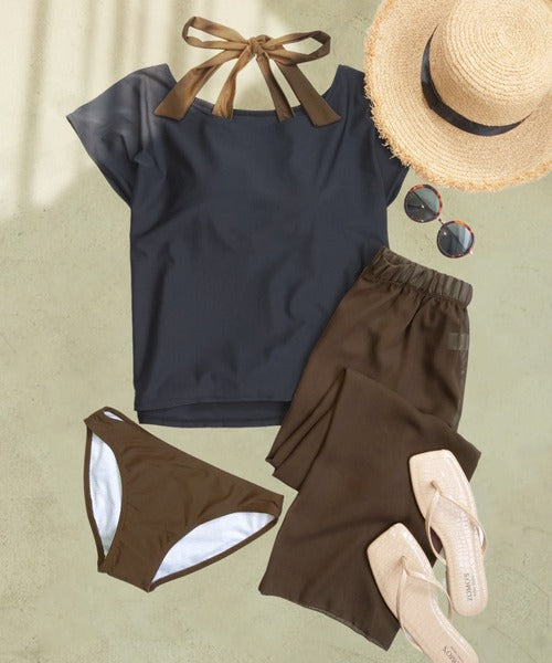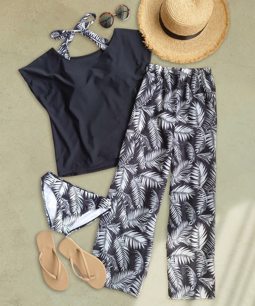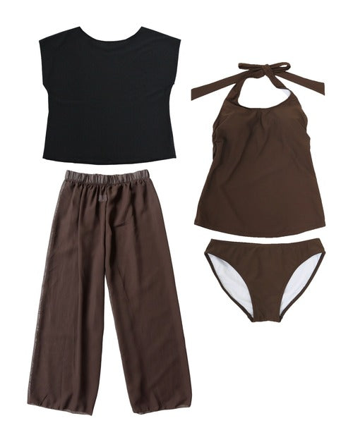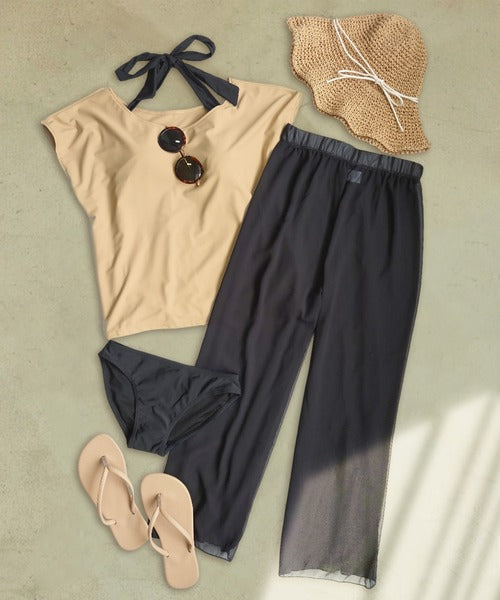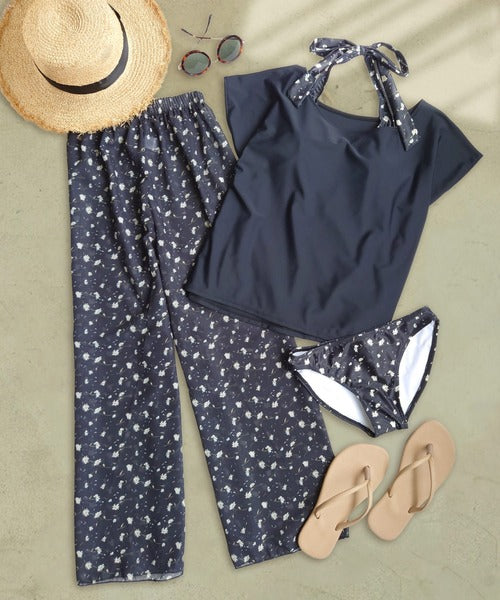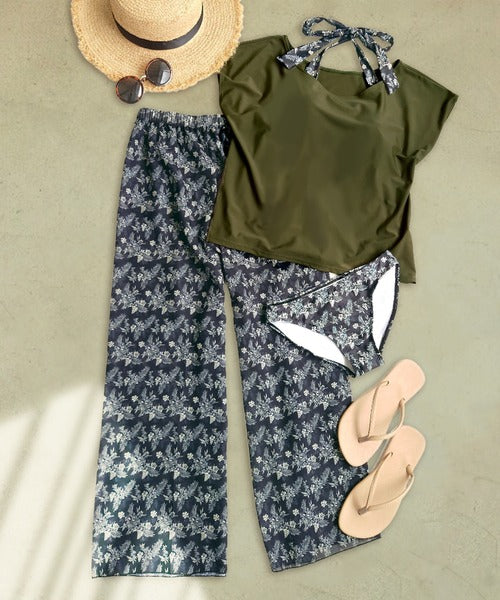 Designed for a casual, chic look, this versatile swimwear set includes a rash guard top, halter-neck tankini top, bikini shorts, and wide-leg sheer pants. The tankini provides elegant shoulder lines and tummy coverage, while the airy long pants create a flattering vertical silhouette.