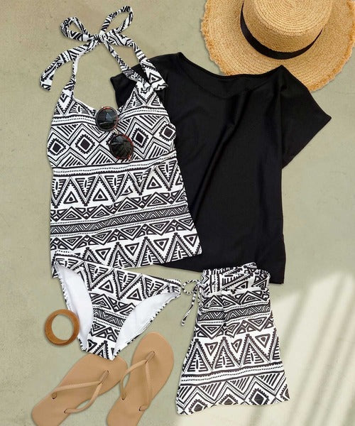 Discover the OSYAREVO 4-Piece Women’s Swimwear Set — the perfect blend of style, comfort, and sun protection. Featuring a halter-neck tankini, shorts, short pants, and a rash guard top, this set is designed to flatter your figure while providing maximum coverage and confidence.