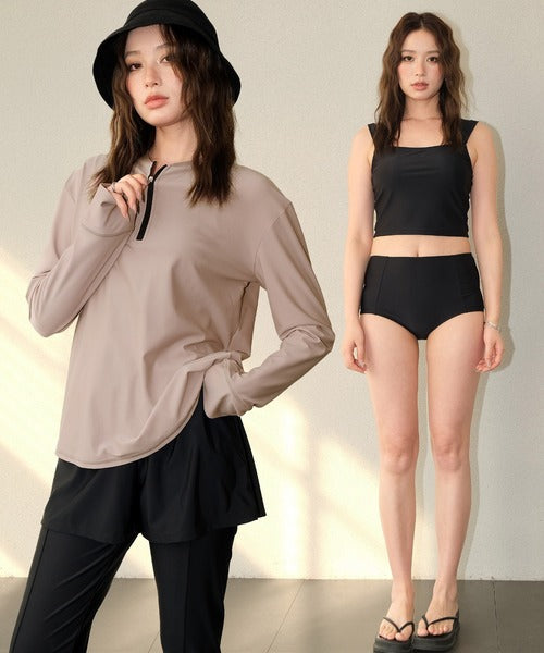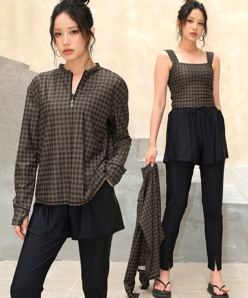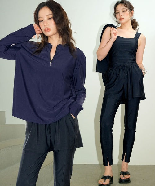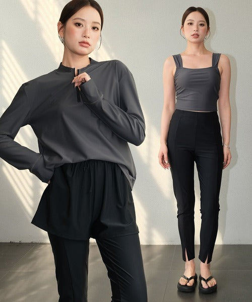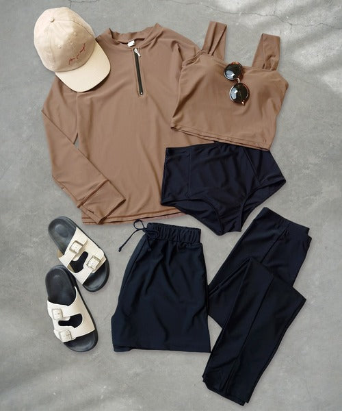 This set includes a front-zip rash guard, a comfortable tankini top, matching shorts, leggings with slits, and briefs — all made from quick-dry, stretchy fabric for a perfect fit.