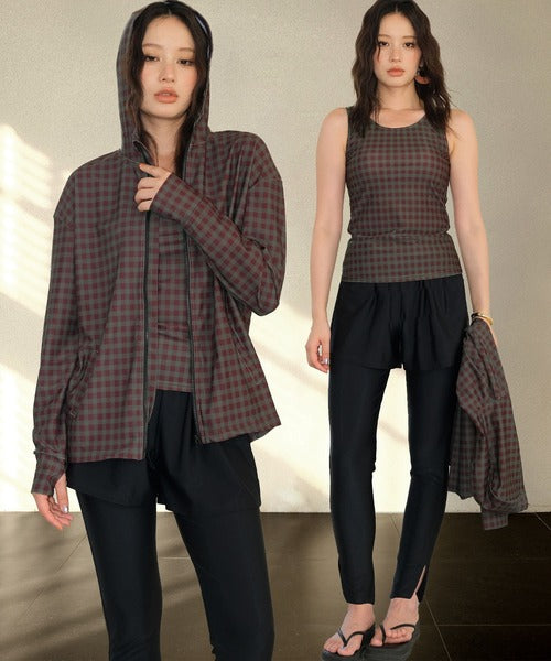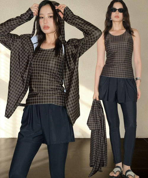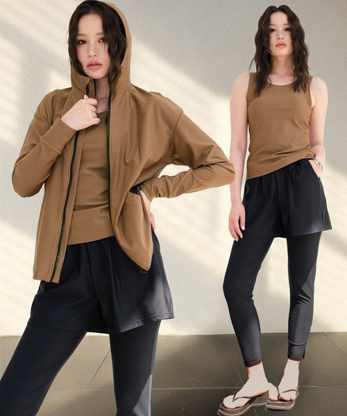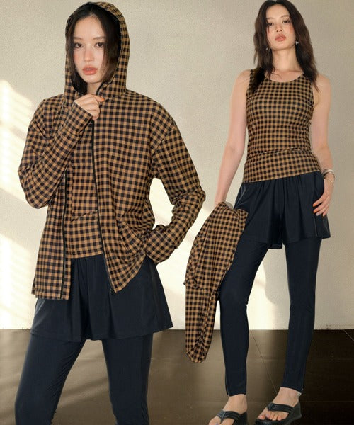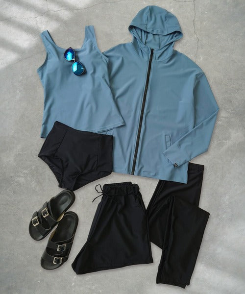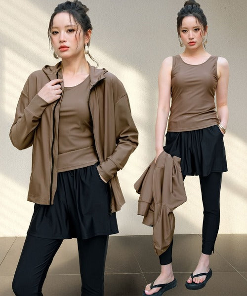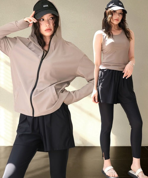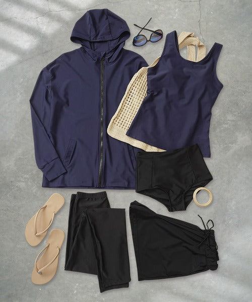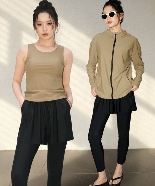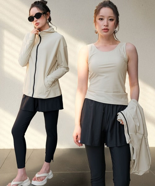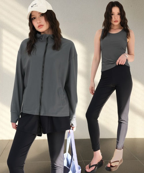 The hooded zip-up rash guard shields your neck and arms, the tankini top provides comfort with built-in padding, and the leggings feature stylish side slits for easy movement. With mix-and-match styling, you can adapt your outfit to any scene.