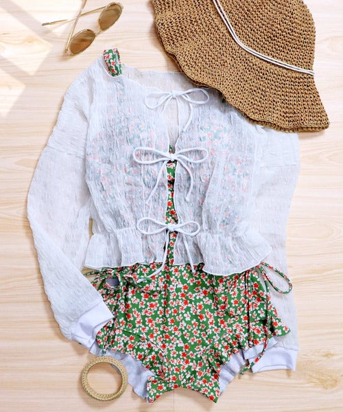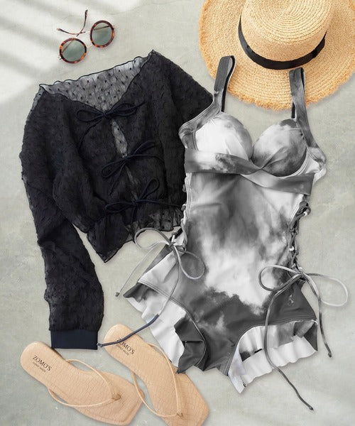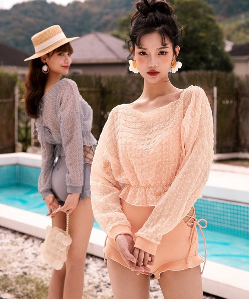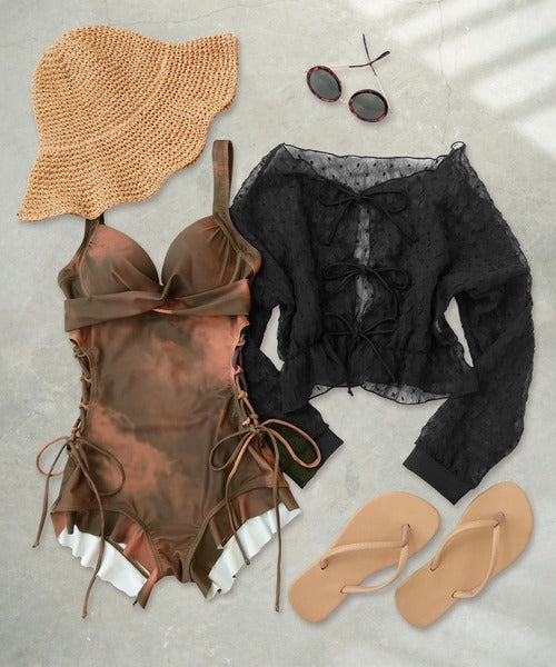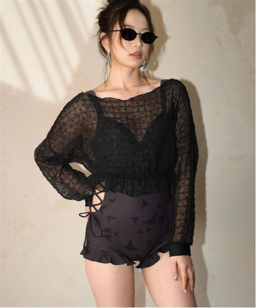 The included sheer top can be worn in two ways — front or back — allowing you to change the look instantly. Made from lightweight, gauze-like fabric, it adds a breezy, airy feel and covers the arms elegantly. Perfect for the beach, pool, sauna, or resort wear.