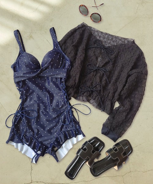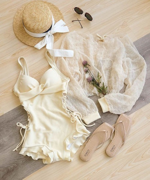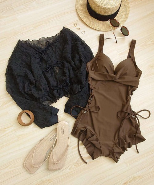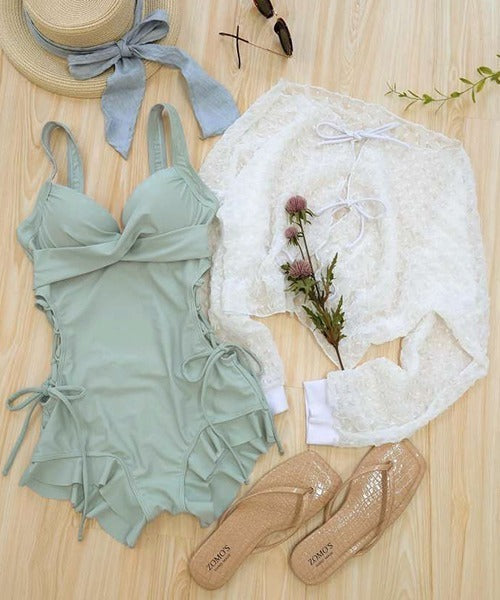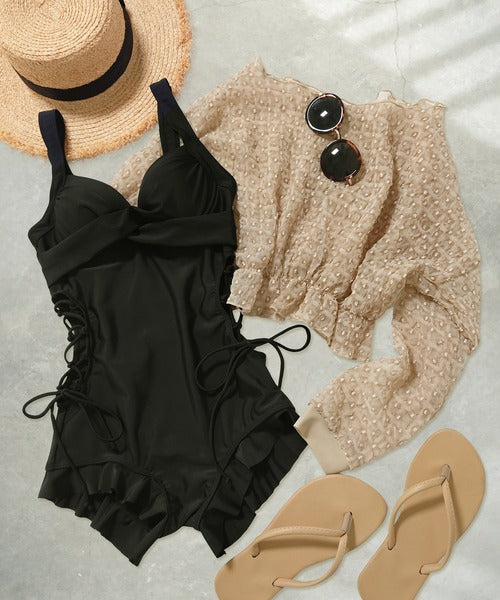 The side lace-up design beautifully highlights the waistline while providing subtle body coverage, and the frill hem softens the look for a balanced, feminine style. The one-piece swimsuit features wired cups to enhance and shape the bust, while adjustable side ties offer a customized fit.