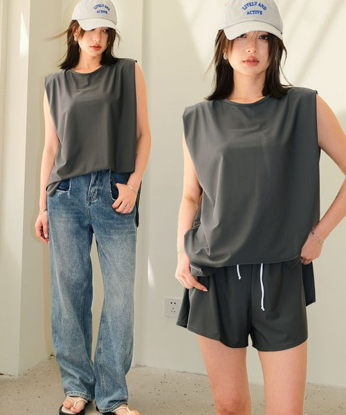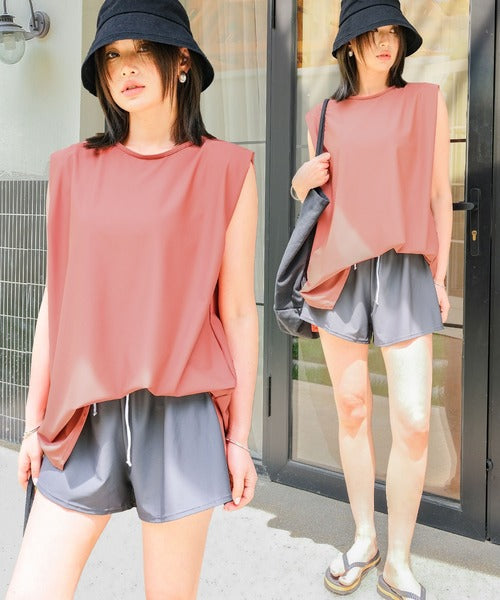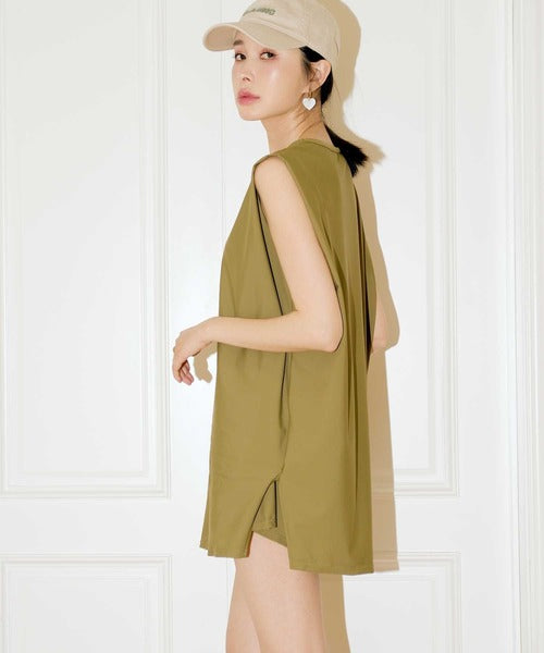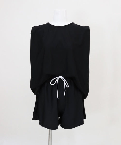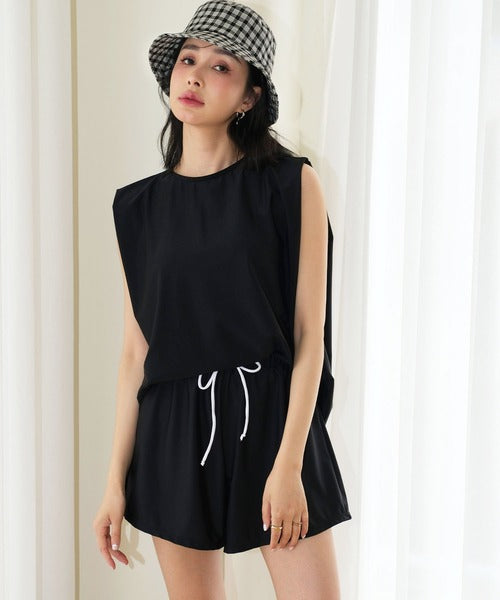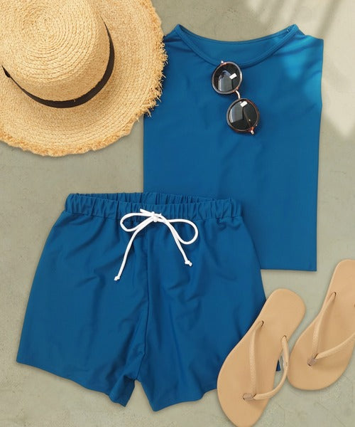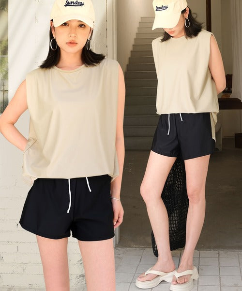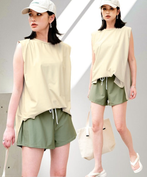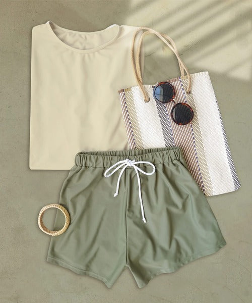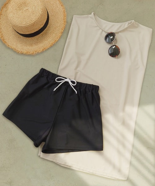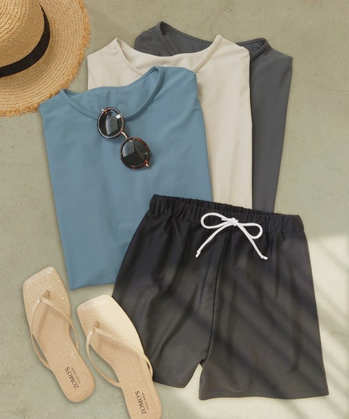 With a UV cut rate of 99.9% and UPF50+, tested and verified by Japanese laboratories, this swimwear shields you from harmful rays whether you’re swimming, at the beach, or enjoying outdoor fitness. The loose box silhouette top subtly covers the arms and hips, while the flared shorts create a flattering leg line.
