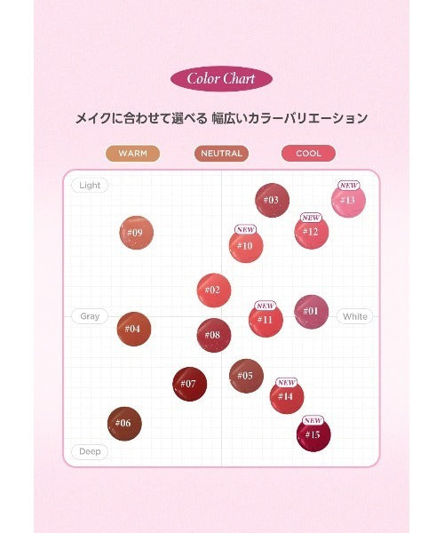 Its watery texture glides on effortlessly, giving lips a fresh, dewy glow that lasts. With subtle pearl particles, it enhances glossiness and creates a soft, luminous finish. Suitable for any skin tone, it adds a natural flush while doubling as both lip care and lip makeup.